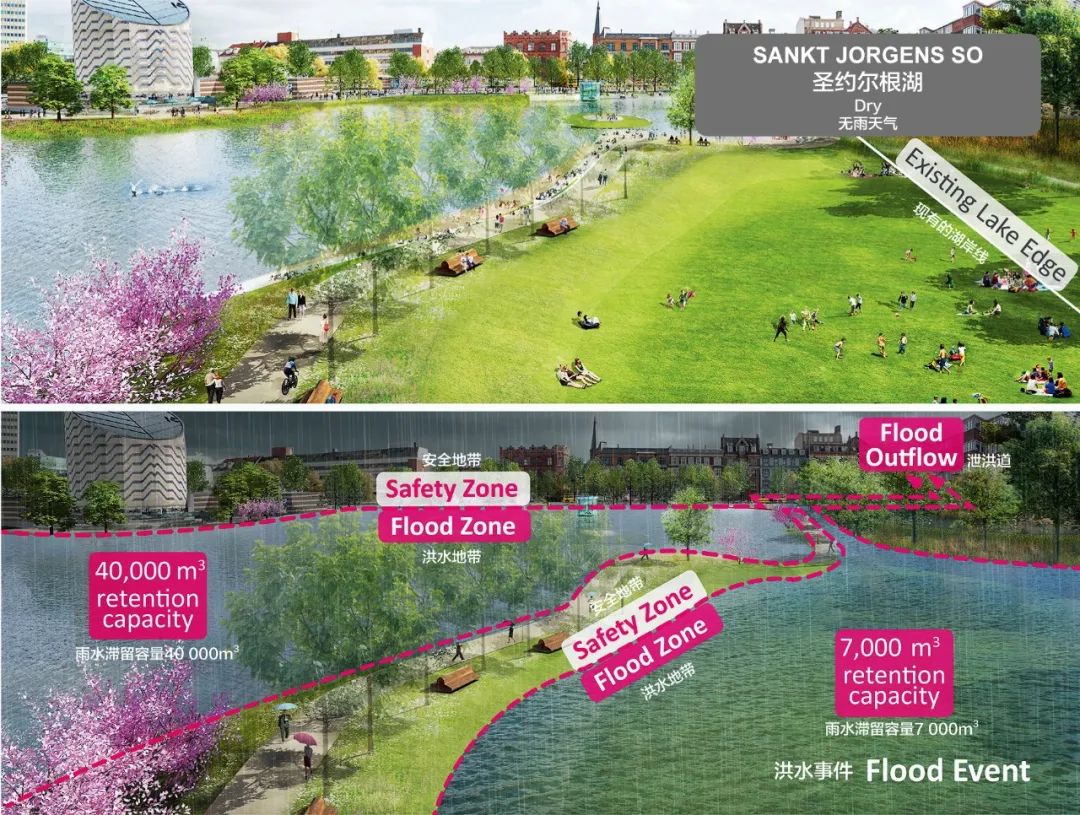 我們的具體策略之一是雨水滯留公園,這是我們的海綿城市“暴雨防控方案”中的一個關(guān)鍵要素。眾所周知,景色怡人的“藍綠公園”能夠為居民健康帶來巨大裨益,而經(jīng)過設(shè)計,這些公園也可以成為吸納特大洪水的“海綿”。該規(guī)劃充分利用哥本哈根市區(qū)三大內(nèi)湖之一的圣約爾根湖,通過將湖水水位由5.8m降低到2.8m,使其成為一座風景秀美的湖濱公園。在提升城市休閑娛樂價值的同時,海綿城市設(shè)計也為城市創(chuàng)造出一大片雨水集蓄區(qū)。而傳統(tǒng)的工程設(shè)計方式則只能通過建造巨型的、造價高昂的泄洪道或管網(wǎng)來傳輸雨水——而鑒于大型暴雨事件十分罕見,這些設(shè)施在絕大多數(shù)情況下都將處于閑置狀態(tài)。與埋設(shè)地下雨洪排水管的工程造價相比,建造于地上的圣約爾根湖方案將節(jié)省大約10億元人民幣。通過這一看似簡單的景觀設(shè)計策略,安博實現(xiàn)了以遠低于傳統(tǒng)水泥蓄水池的成本來建造巨型蓄水設(shè)施的目標。更為重要的是,人們可以走進我們新建的藍綠公園,享受閑暇與歡愉。
