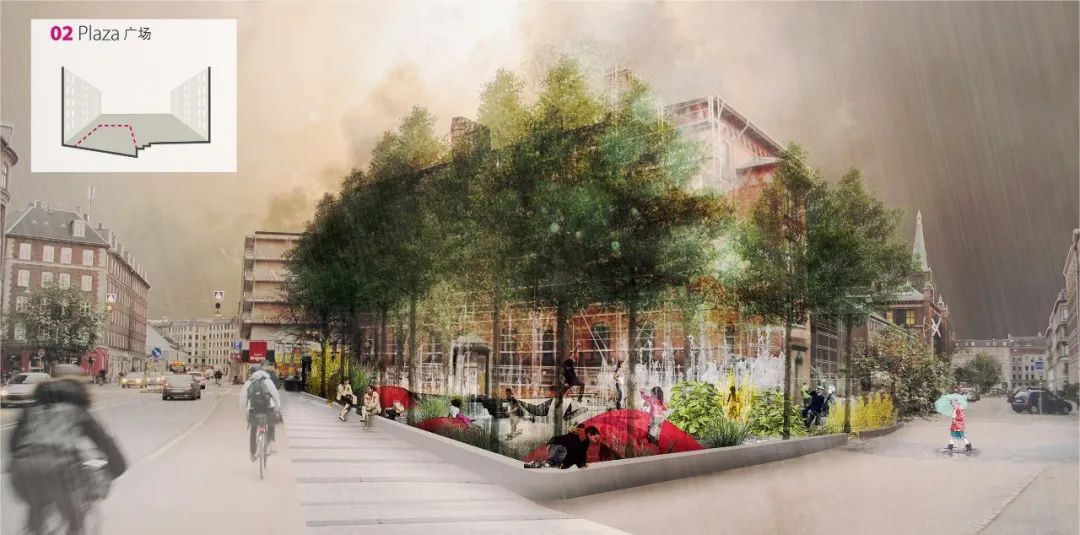 哥本哈根市中心的圣安妮廣場是暴雨防控詳細規(guī)劃中的首個建成項目。廣場毗鄰女王的宮殿,距著名的美人魚銅像不遠。該區(qū)域曾是特大暴雨事件中受災最嚴重的區(qū)域之一,而如今已轉(zhuǎn)變?yōu)橐蛔晁疁艄珗@。