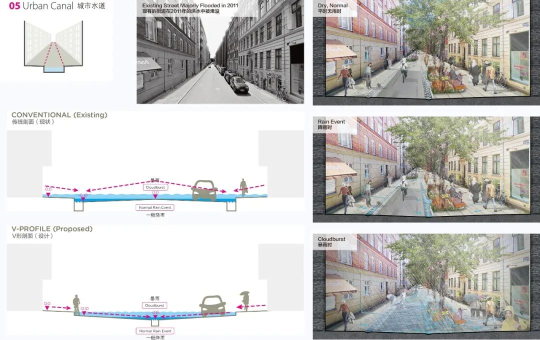 哥本哈根暴雨防控詳細規(guī)劃采用截然不同的方式來設(shè)計這些大道。新設(shè)計的林蔭道將道路剖面變?yōu)椤癡”形,使中間的綠化低地形成一條巨大的海綿滯流帶。暴雨天氣時,雨水將從兩側(cè)的建筑物流向中間綠化帶。索恩德大道在暴雨天氣下的徑流流量將達到3.3m3/s。而在正常降雨及無雨天氣時,低洼的綠帶則可成為周邊居民的休閑場所。