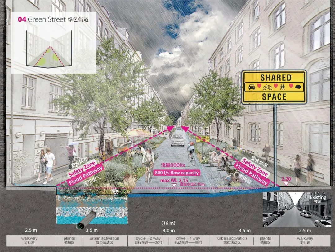 另一個用來緩解極端暴雨影響的具體策略是雨水滯留街道。這些街道通常是位于低洼、脆弱區(qū)域上游的次級道路,通過街道內(nèi)部的設(shè)計來創(chuàng)造巨大的蓄水空間。在不對交通產(chǎn)生重大妨礙的情況下,這些次級道路通??杀桓脑斐捎晁疁艚值馈Mㄟ^增加洼地、透水鋪裝等方式實現(xiàn)對雨水的滯留,并可以凈化雨水,從而實現(xiàn)對地下含水層的補給。