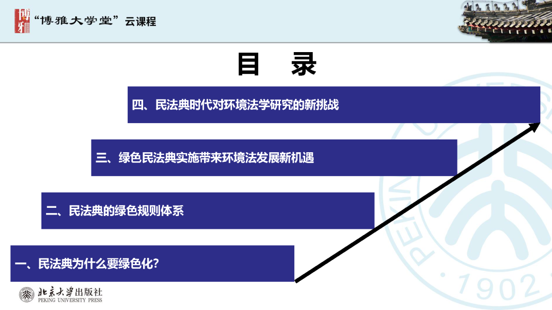 本文為?呂忠梅?老師在博雅大學(xué)堂上的報(bào)告。題目為《綠色民法典實(shí)施:環(huán)境法的機(jī)遇與挑戰(zhàn)》。內(nèi)容主要涉及民法典為什么要綠色化、民法典的綠色規(guī)則體系及綠色民法典給環(huán)境法帶來(lái)的新機(jī)遇和新挑戰(zhàn)。