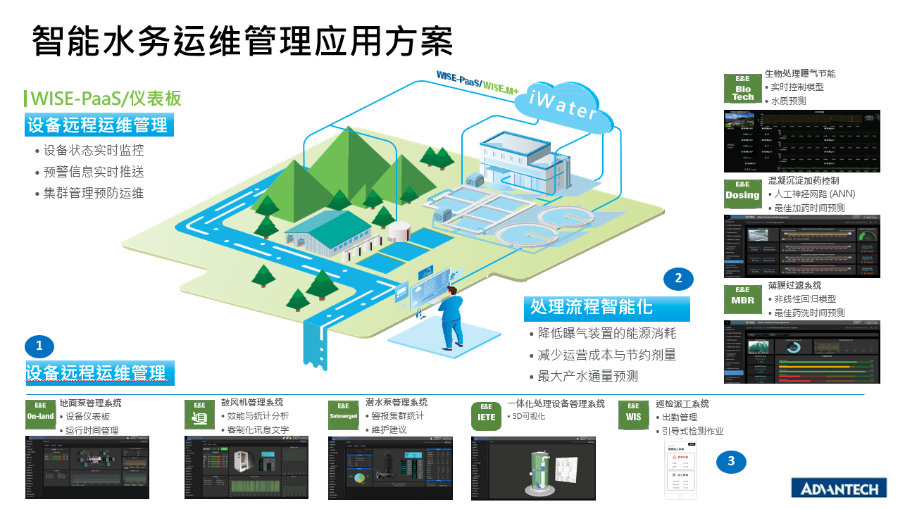通過研華科技一站式水處理運(yùn)維管理平臺(tái),提供數(shù)據(jù)采集,數(shù)據(jù)分析,信息可視化及預(yù)警信息推送;同時(shí)通過虛擬化對(duì)象配置、管理及模組化儀表板、2D/3D流程交互可視化展示,快速進(jìn)行系統(tǒng)整合,實(shí)現(xiàn)精準(zhǔn)管理、預(yù)防運(yùn)維,讓水資源使用、監(jiān)控與管理者得以發(fā)揮最大效益與效能。