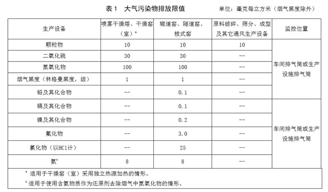 《排放標(biāo)準(zhǔn)》規(guī)定了陶瓷工業(yè)企業(yè)或生產(chǎn)設(shè)施的大氣污染物排放限值及控制要求、大氣污染物監(jiān)測(cè)、達(dá)標(biāo) 判定要求和實(shí)施與監(jiān)督。