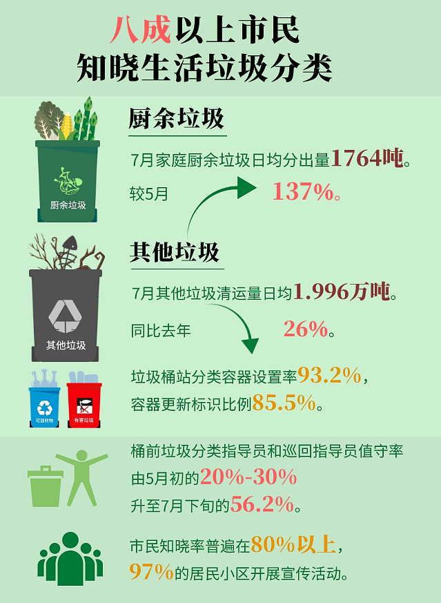 截至7月底,北京市家庭廚余垃圾日均分出量1764噸,較5月增長了137%。