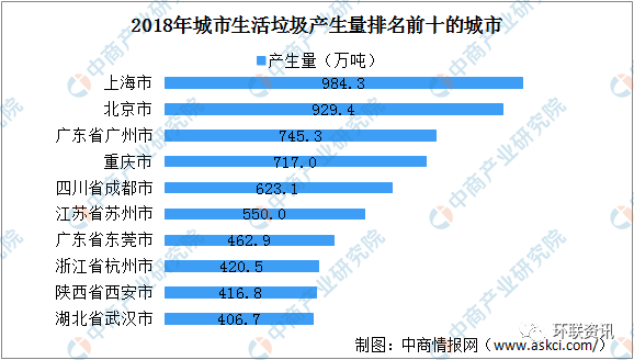 數(shù)據(jù)來源:生態(tài)環(huán)境部、中商產(chǎn)業(yè)研究院整理前十城市生活垃圾產(chǎn)生量共計(jì)6256.0萬噸,占全部信息發(fā)布城市產(chǎn)生總量的29.6%。經(jīng)濟(jì)發(fā)達(dá)的城市生活垃圾產(chǎn)量大,上海、北京生活垃圾產(chǎn)生量超900萬噸,分別為984.3萬噸、929.4萬噸。此外,廣州市、重慶市、成都市、蘇州市生活垃圾產(chǎn)生量超500萬噸。