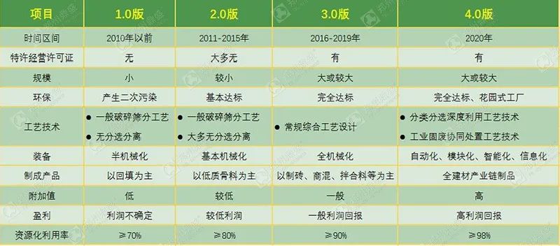 而4.0版是指在現(xiàn)代化工廠資源化處理的基礎(chǔ)上,再附加互聯(lián)網(wǎng)、衛(wèi)星定位等現(xiàn)代高端技術(shù),將建筑垃圾資源化過(guò)程中的每一個(gè)環(huán)節(jié)精細(xì)化控制和處理,生產(chǎn)出利潤(rùn)空間大、高附加值產(chǎn)品,盈利模式可以不再依靠政府補(bǔ)貼而進(jìn)行市場(chǎng)化運(yùn)營(yíng)的發(fā)展模式。