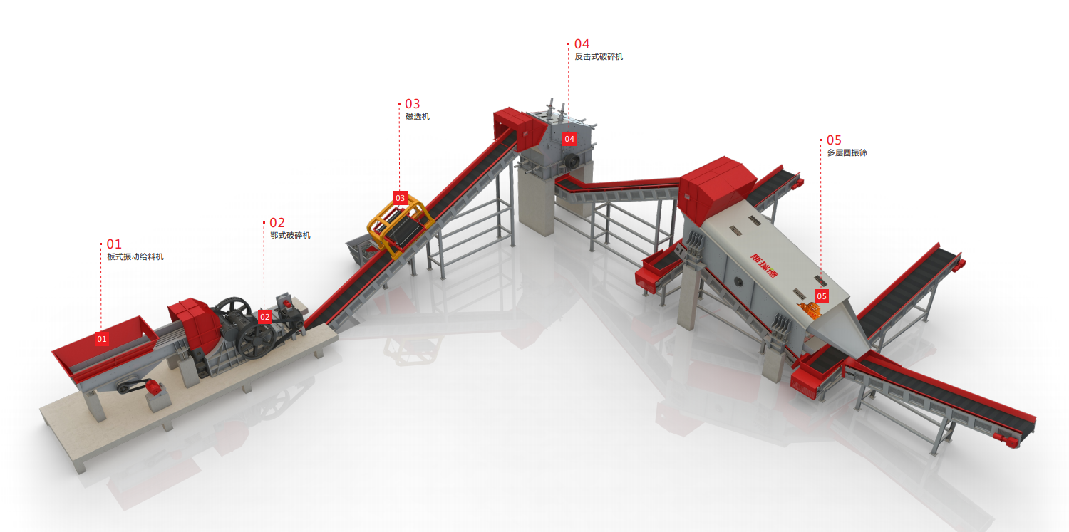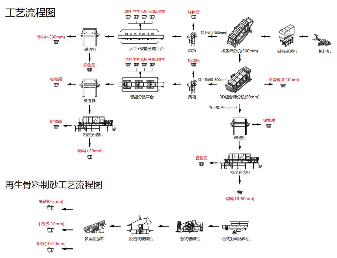 斯瑞德建筑裝修垃圾預處理方案利用不同的振動篩、馳張篩組成篩分系統(tǒng),將裝修垃圾按照尺寸進行篩分,從而獲得不同尺寸的粉料、骨料;通過人工分選、智能分選、磁選等分選流程,回收紙板、廢舊金屬、塑料、木材等再生資源;采用風選篩分出可以制造RDF的輕質(zhì)物料,實現(xiàn)裝修垃圾的價值最大化。