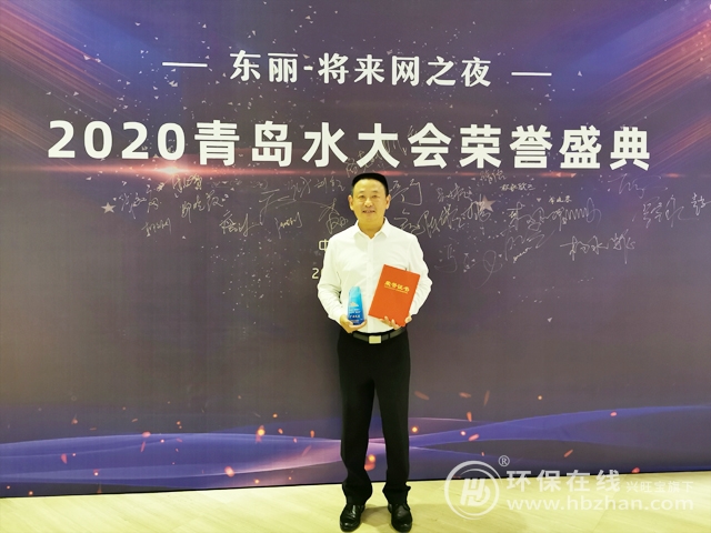 圖為本屆青島水大會 天創(chuàng)環(huán)境市場部總監(jiān)程志軍代表企業(yè)上臺獲獎