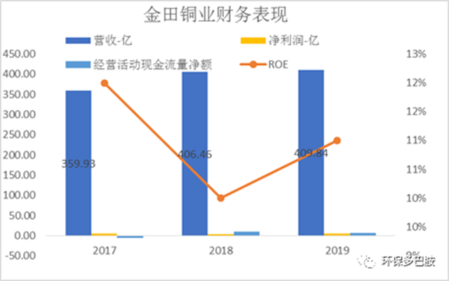 財(cái)務(wù)表現(xiàn)上:公司作為再生銅加工龍頭企業(yè),其規(guī)模優(yōu)勢(shì)明顯,2019年?duì)I收規(guī)模達(dá)410億,但公司主要銅產(chǎn)品的定價(jià)原則為“原材料價(jià)格+加工費(fèi)”,利潤(rùn)主要來(lái)自于相對(duì)穩(wěn)定的加工費(fèi), 而由于原材料銅的價(jià)值較高,且廢雜銅與陰極銅的價(jià)差較小,銅加工行業(yè)具有“料重工輕”的特點(diǎn),公司毛利僅約4%,有時(shí)甚至倒掛。從這個(gè)角度,金田銅業(yè)雖做的是再生銅生意,但更符合銅產(chǎn)品加工制造業(yè)的特征。