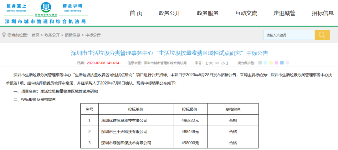 7月8日,深圳市生活垃圾分類管理事務(wù)中心“生活垃圾按量收費(fèi)區(qū)域性試點(diǎn)研究項(xiàng)目”開標(biāo),服務(wù)期限:2020年7月10日-2020年12月10日。