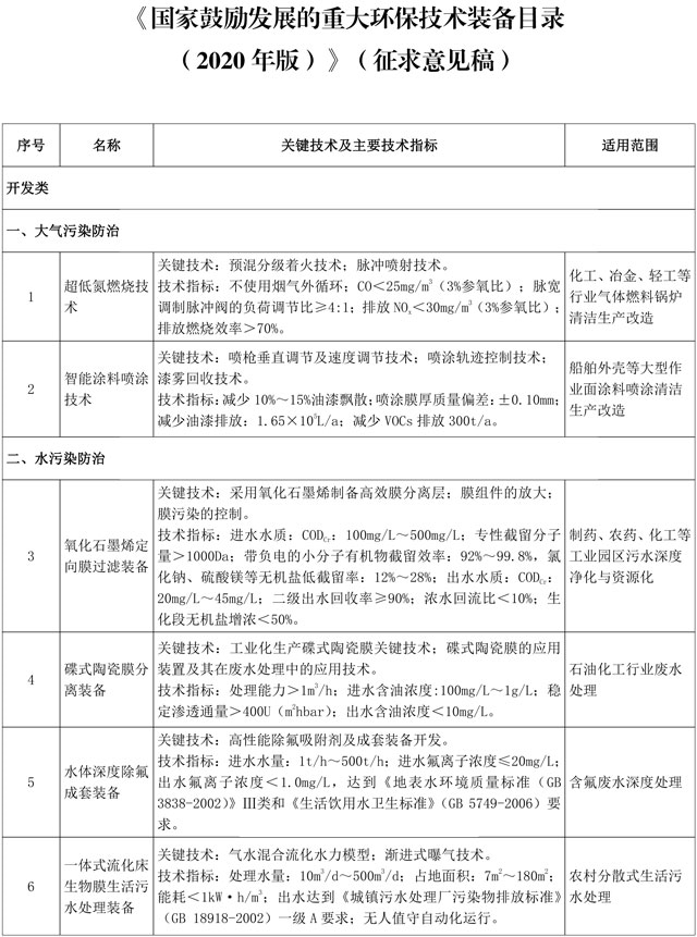 公開(kāi)征求對(duì)《國(guó)家鼓勵(lì)發(fā)展的重大環(huán)保技術(shù)裝備目錄(2020年版)》(征求意見(jiàn)稿)的意見(jiàn)