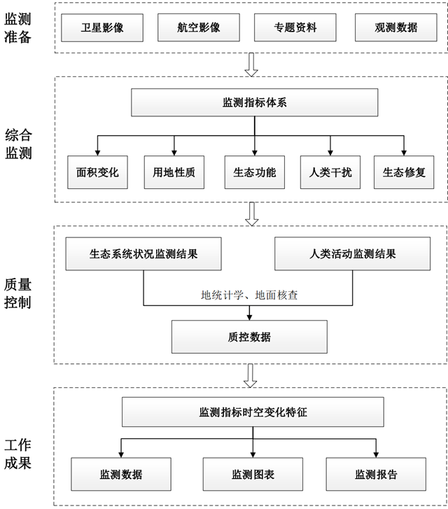 采用衛(wèi)星遙感、近地面航空遙感(無人機(jī))、地面監(jiān)測相結(jié)合,以衛(wèi)星遙感監(jiān)測為主的技術(shù)方法,即先利用高時空衛(wèi)星遙感開展監(jiān)測因子普查,然后利用無人機(jī)對典型地區(qū)進(jìn)行抽查,再到野外現(xiàn)場開展關(guān)鍵生態(tài)因子監(jiān)測和存疑斑塊核查。