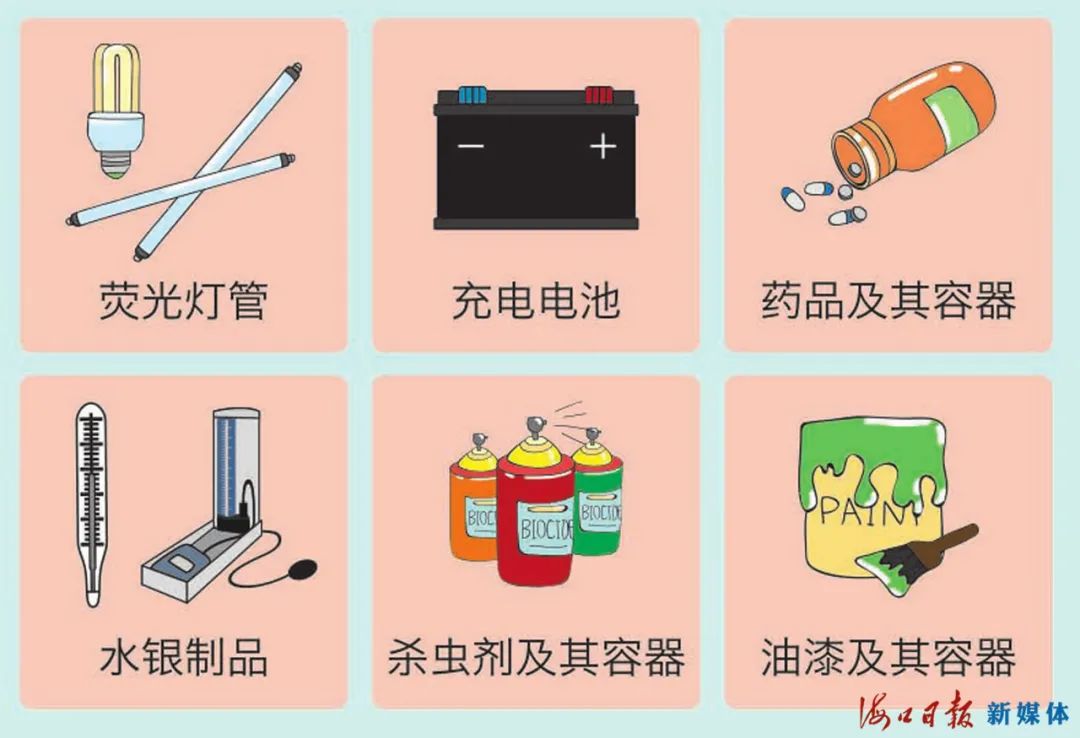 主要包括:廢電池(鎘鎳電池、氧化汞電池、鉛蓄電池等),廢熒光燈管(日光燈管、節(jié)能燈等),廢溫度計(jì),廢血壓計(jì),廢藥品及其包裝物,廢油漆、溶劑及其包裝物,廢殺蟲(chóng)劑、消毒劑及其包裝物,廢膠片及廢相紙等。