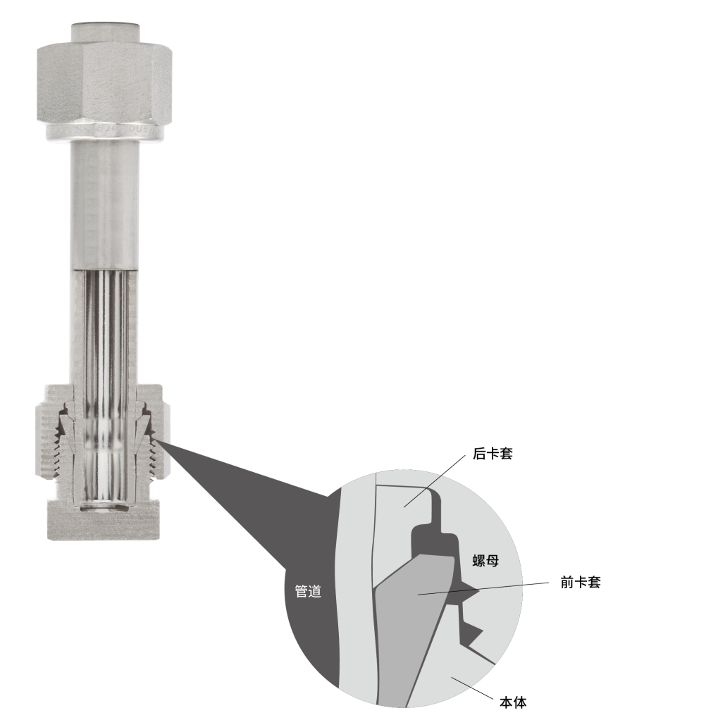 在如上的裝配過程中,前卡套被打入裝配體和管道中,以形成主密封,而后卡套向內(nèi)鉸鏈,以形成對管道的有力抓握。后卡套的幾何結(jié)構(gòu)允許改進(jìn)的工程鉸鏈夾頭作用,將軸向運動轉(zhuǎn)化為管子上的徑向擠鍛作用,但在裝配扭矩要求較低的情況下工作。