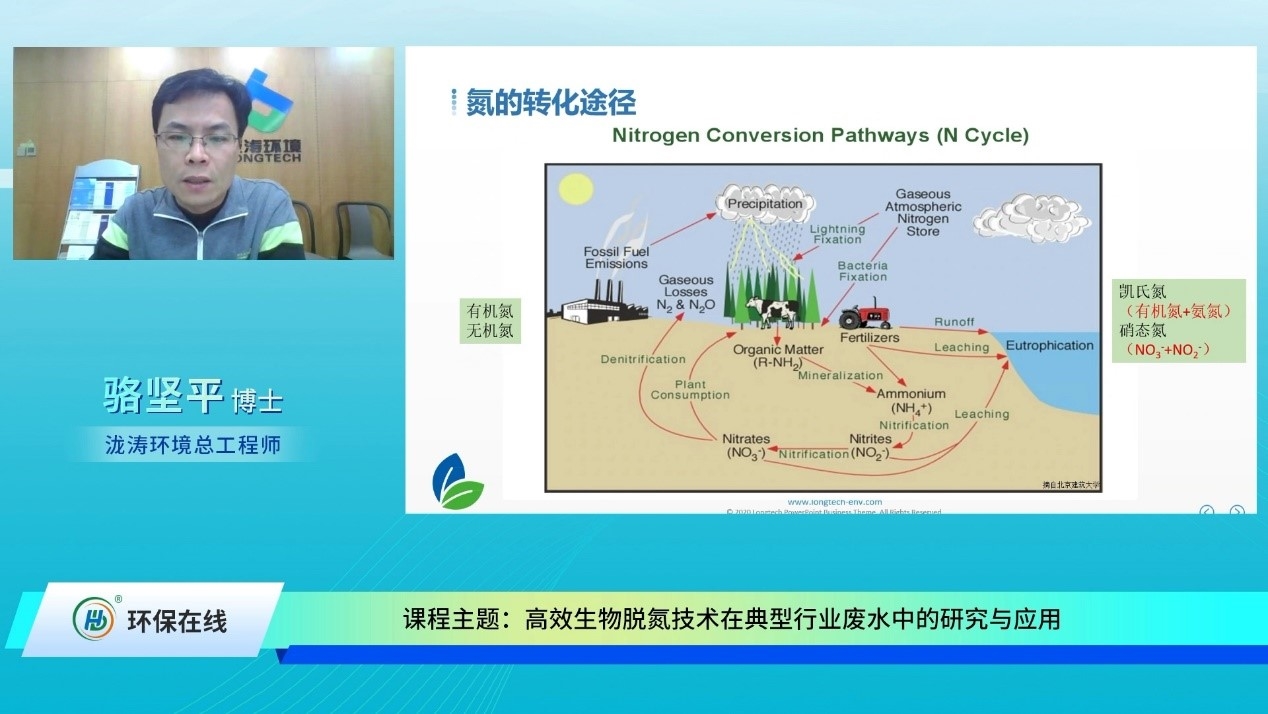 課程直播中,駱博士從生物脫氮原理、影響因素、脫氮工藝及案例等3個(gè)主要方面進(jìn)行了闡述,對(duì)傳統(tǒng)脫氮工藝的優(yōu)缺點(diǎn)展開剖析,詳細(xì)講解了短程硝化反硝化、厭氧氨氧化等新型脫氮技術(shù)的工藝流程與優(yōu)勢(shì),并分享了化學(xué)合成制藥廢水、屠宰廢水、工業(yè)坑塘廢水等具體應(yīng)用案例。