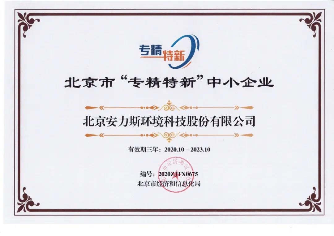 2020年7月,北京市經(jīng)濟(jì)和信息化委員會(huì)公示《2020年度北京市“專精特新”中小企業(yè)》第二批名單,北京安力斯環(huán)境科技股份有限公司(以下簡(jiǎn)稱“安力斯環(huán)境”)成功入選,被授予2020年度北京市“專精特新”中小企業(yè)稱號(hào)。
