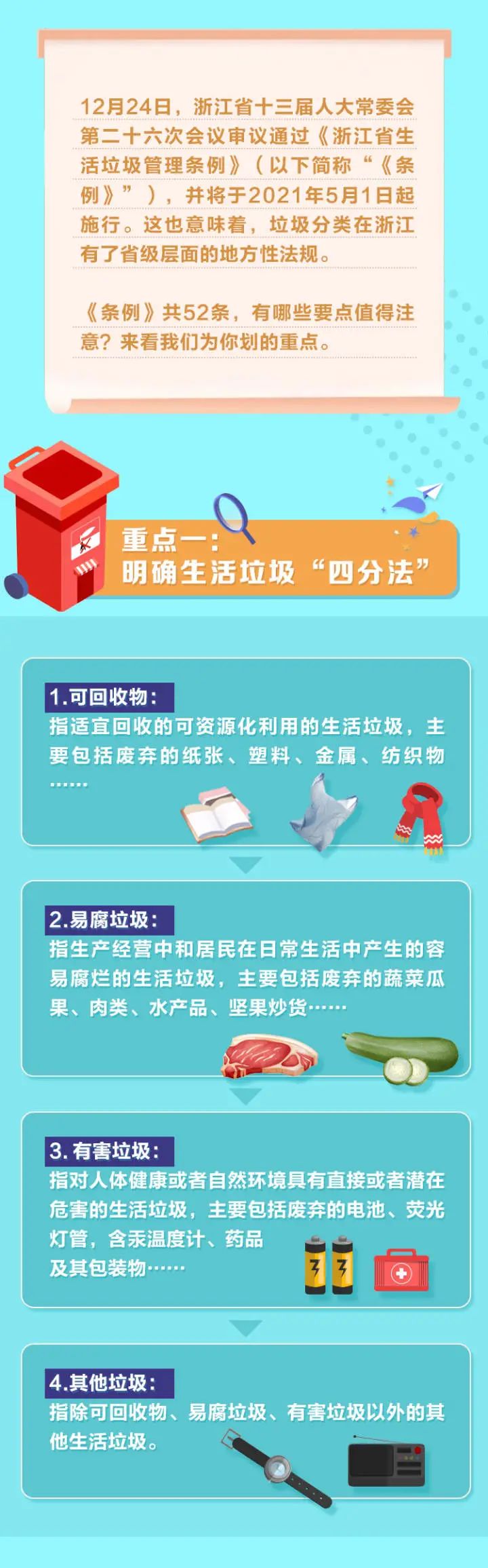 第五十二條 本條例自2021年5月1日起施行。浙江省人民政府發(fā)布的《浙江省城鎮(zhèn)生活垃圾分類管理辦法》同時廢止。