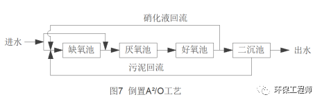 與常規(guī)的A2/O工藝相比,倒置A2/O工藝(見圖7)從前往后以此為缺氧-厭氧-好氧,該工藝的設計初衷是為了降低污泥回流中硝態(tài)氮對厭氧釋磷的影響,特別是對于高氨氮廢水污泥回流中攜帶有大量的硝氮,抑制厭氧釋磷反應。同時,為了解決碳源分配的問題,采用兩點進水的方式來提供厭氧釋磷中有機物的消耗。