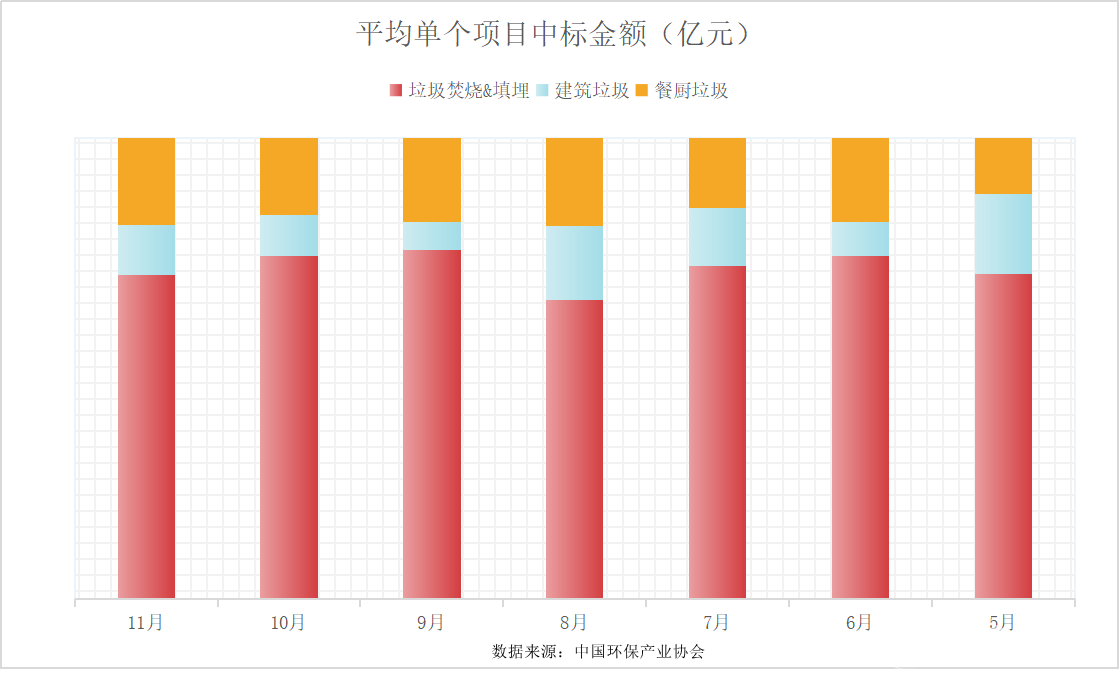 2020年前11個(gè)月,全國垃圾焚燒中標(biāo)項(xiàng)目共計(jì)311項(xiàng),總投資金額共計(jì)655.15億元;餐廚垃圾處理處置中標(biāo)項(xiàng)目共計(jì)361項(xiàng),總投資金額194.6億元;2020年5月到11月,全國建筑垃圾處理處置中標(biāo)項(xiàng)目共計(jì)213項(xiàng),總投資金額61.85億元。