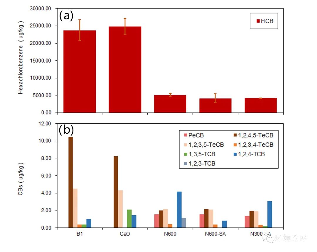 對(duì)實(shí)驗(yàn)組的六氯苯及其他氯苯的總量進(jìn)行測(cè)試分析,結(jié)果如圖5所示,可見(jiàn)n-Al/CaO對(duì)于氯代有機(jī)物的去除有較為顯著的效果。相比于未經(jīng)處理的飛灰樣品和使用CaO進(jìn)行處理的對(duì)照組,實(shí)驗(yàn)組的六氯苯及氯苯類(lèi)物質(zhì)總量均有顯著的下降,在最佳實(shí)驗(yàn)組N600SA中超過(guò)82.43%的六氯苯被降解去除。