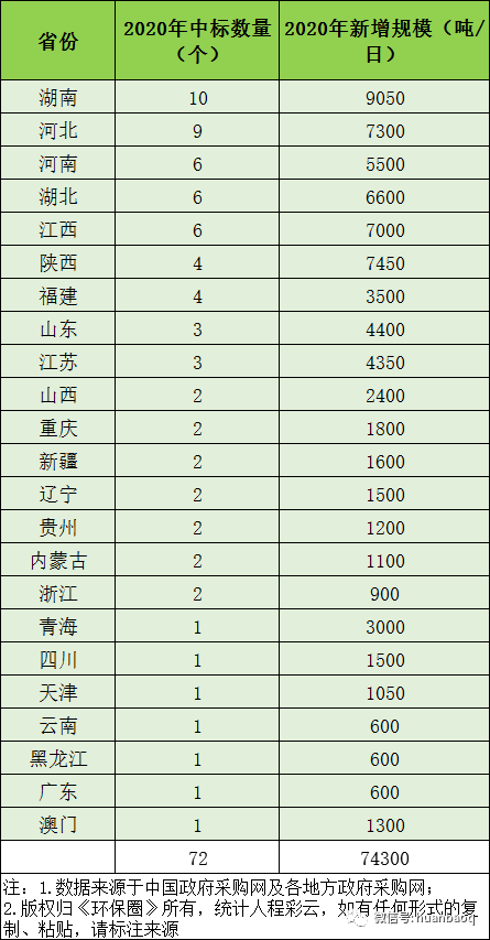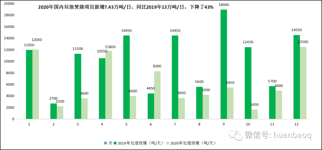 稍加留意就會(huì)發(fā)現(xiàn),相較于前兩年的大項(xiàng)目頻現(xiàn),各家企業(yè)中標(biāo)捷報(bào)頻傳,2020年類似的報(bào)道少了許多,全國釋放的垃圾焚燒項(xiàng)目罕見下滑,新增項(xiàng)目開始“降溫”。這一現(xiàn)象,筆者早在去年6月就注意到了,當(dāng)時(shí)還以為是受疫情的影響,但其實(shí)大家都想錯(cuò)了。據(jù)筆者長期跟蹤各省政府采購網(wǎng)統(tǒng)計(jì)得出,2020年1月-12月,國內(nèi)新中標(biāo)的垃圾焚燒發(fā)電項(xiàng)目累計(jì)72個(gè),相比2019年新中標(biāo)120個(gè)項(xiàng)目減少48個(gè),同比下滑了40%;新增日處理規(guī)模7.43萬噸/日,相比2019年近13萬噸/日的新增規(guī)模,同比減少了43%;總投資373億元,相比2019年總投資600億元也減少了227億元,降幅達(dá)到37.83%。(項(xiàng)目清單詳見文末)看得出來,2020年國內(nèi)釋放的垃圾焚燒項(xiàng)目,無論是中標(biāo)數(shù)量,還是日處理規(guī)模,亦或是總投資額,與2019年相比都有4-5成左右的下滑,下降的不是一點(diǎn)點(diǎn),而是幾乎“腰斬”。從月份來看,除了1月、4月、6月,2020年新增的日處理規(guī)模較2019年有所增長外,其余每個(gè)月份都有著不同程度的下滑,少則3-6千噸/日,多則上萬噸/日。其中,5月、7月、9月、10月四個(gè)月的下降幅度最大,均是萬噸/日級(jí)別以上的減少。(如圖一、圖二所示)圖一:2019年VS2020年,全國釋放的垃圾焚燒項(xiàng)目規(guī)模對(duì)比圖二:2020年國內(nèi)垃圾焚燒項(xiàng)目新增7.43萬噸/日,同比下降了43%02