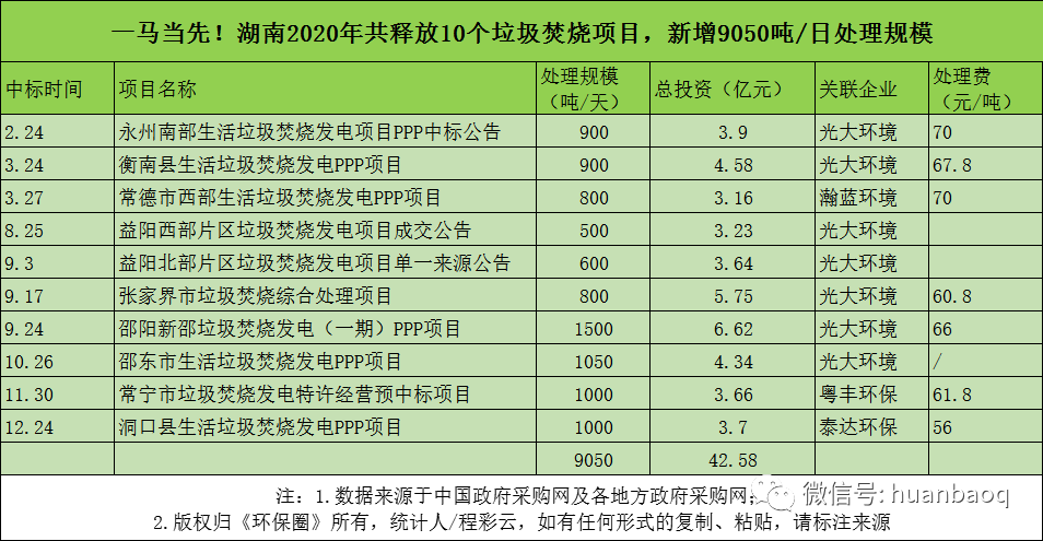 從項(xiàng)目分布的省份來看,2020年定標(biāo)的72個(gè)垃圾焚燒項(xiàng)目,分別分布在湖南、湖北、河南、河北、江西、陜西、福建、山東、江蘇等23個(gè)省市,其中湖南、湖北、江西、陜西在垃圾焚燒領(lǐng)域大放異彩,成為全國興建垃圾焚燒廠數(shù)量最多、新增規(guī)模最大的4個(gè)省份(如圖三、圖四所示)。圖三:2020年定標(biāo)的72個(gè)垃圾焚燒項(xiàng)目,分布的省市圖四:2020年國內(nèi)各?。ㄊ校├贌袠?biāo)的數(shù)量、新增規(guī)模排行但與此同時(shí),總體上看,2020年國內(nèi)絕大多數(shù)地區(qū)垃圾焚燒投資速度都是在放緩的,政府招投標(biāo)活動(dòng)不及2019年,下滑幅度最大的是“冀魯豫”三省。以河南為例,2019年河南省累計(jì)開標(biāo)26個(gè)垃圾焚燒項(xiàng)目,新增處理規(guī)模3.22萬噸/日;而到了2020年,則只有6個(gè)垃圾焚燒項(xiàng)目完成評(píng)標(biāo),新增處理規(guī)模5500噸/日,只有2019年的“零頭”。在河北,2019年全省新增21個(gè)垃圾焚燒項(xiàng)目,新增處理規(guī)模2.51萬噸/日;而到了2020年,這一數(shù)據(jù)則下滑到9個(gè)項(xiàng)目,新增處理規(guī)模7300噸/日,不足2019年的1/3。還有山東省,2019年山東全省共有11座垃圾焚燒項(xiàng)目完成定標(biāo)工作,新增處理規(guī)模近萬噸/日;而2020年,山東則只有3個(gè)垃圾焚燒項(xiàng)目開啟招標(biāo),新增規(guī)模不及2019年的一半。與以上這些省份相比,“兩湖兩西”--湖南、湖北、山西、陜西4省,則在其他省市投資速度放緩時(shí)“”異軍突起,不懼國補(bǔ)滑坡的負(fù)面效應(yīng),在2020年迎來了垃圾焚燒市場(chǎng)的大爆發(fā)。4省之中,湖南省“一馬當(dāng)先”。省內(nèi)永州、常德、益陽、張家界、常寧、邵陽等城市紛紛開啟招投標(biāo)工作,2020年共有10個(gè)垃圾焚燒項(xiàng)目完成定標(biāo),新增9050噸/日的處理規(guī)模,僅光大環(huán)境一家就斬獲其中7個(gè)項(xiàng)目,吃掉了70%的市場(chǎng)份額,成為湖南垃圾焚燒市場(chǎng)的“大贏家”(如圖五所示)。湖北也是“不甘落后”。雖然釋放速度不及湖南,但去年也是新增了6個(gè)垃圾焚燒大標(biāo),其中4個(gè)都是千噸級(jí)別的項(xiàng)目,宜昌市垃圾焚燒項(xiàng)目更是難得一見2250噸/日的大項(xiàng)目,吸引了光大環(huán)境、中國環(huán)境保護(hù)集團(tuán)、綠色動(dòng)力、深能、康恒環(huán)境等固廢大咖前來競(jìng)標(biāo)(如圖六所示)。圖六:2020年湖北省垃圾焚燒項(xiàng)目新增情況還有江西省。據(jù)《環(huán)保圈》跟蹤發(fā)現(xiàn),2019年江西垃圾焚燒新增規(guī)模共計(jì)3400噸/日,而2020年這一數(shù)據(jù)則攀升至7000噸/日,其中5個(gè)垃圾焚燒項(xiàng)目都是千噸級(jí)別以上(如圖七所示)。圖七:2020年江西省垃圾焚燒項(xiàng)目新增情況增長最明顯還屬陜西省。據(jù)《環(huán)保圈》進(jìn)一步跟蹤,2019年陜西境內(nèi)大多生活垃圾還靠填埋,垃圾焚燒普及率非常低,鄰避矛盾突出。而到了2020年,西安灞橋區(qū)、寶雞市、安康市、渭南中心城區(qū)等地紛紛開啟項(xiàng)目招投標(biāo)工作,雖然只有4個(gè)項(xiàng)目完成了定標(biāo)工作,但處理規(guī)模也一躍達(dá)到7500噸/日,僅次于湖南(如圖八所示)。圖八:2020年陜西省垃圾焚燒項(xiàng)目新增情況03