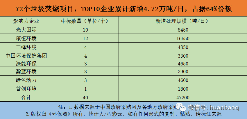 一家獨(dú)大,多強(qiáng)并進(jìn)!說到行業(yè)集中度,先回顧一下2019年的情況。在2019年釋放的120個(gè)垃圾焚燒項(xiàng)目中,光大環(huán)境、康恒環(huán)境、中國環(huán)境保護(hù)、首創(chuàng)環(huán)境等業(yè)內(nèi)影響力企業(yè)累計(jì)中標(biāo)60座垃圾焚燒項(xiàng)目,占比全國新增項(xiàng)目的50%,日處理規(guī)模高達(dá)66550噸,約占全國新增處理規(guī)模的52%。僅光大環(huán)境一家,就“吃掉”了全國22%的份額。2019年斬獲22個(gè)項(xiàng)目新增2.87萬噸/日規(guī)模,約占2019年全國新增處理規(guī)模的22%,在國內(nèi)垃圾焚燒版圖中,已經(jīng)實(shí)現(xiàn)了“五分天下有其一”。據(jù)筆者進(jìn)一步觀察,2020年定標(biāo)的72個(gè)垃圾焚燒項(xiàng)目,還是被業(yè)界熟知的康恒環(huán)境、光大環(huán)境、偉明環(huán)保、海螺投資、三峰環(huán)境、綠色動(dòng)力、中國環(huán)境保護(hù)等在內(nèi)22家固廢龍頭企業(yè)“瓜分”(如圖十所示)。圖十:22家固廢龍頭企業(yè)“瓜分”72個(gè)垃圾焚燒項(xiàng)目有意思的是,與2019年相比,2020年絕大多數(shù)固廢企業(yè)拿單能力減弱,比如光大環(huán)境,2019年入手了22個(gè)項(xiàng)目,新增2.87萬噸/日的焚燒規(guī)模;而到了2020年則只斬獲了10個(gè)項(xiàng)目,新增規(guī)模不足1萬噸/日,約8450噸/日,且集中在湖南地區(qū)。再比如城發(fā)環(huán)境,受河南垃圾焚燒市場(chǎng)的萎縮,城發(fā)環(huán)境2020中標(biāo)的垃圾焚燒項(xiàng)目減少了一半,只拿到5個(gè)項(xiàng)目,其中有4個(gè)位于河南,還有1個(gè)選址新疆昌吉市。值得一提,在其他家企業(yè)投資放緩時(shí),業(yè)界“黑馬”康恒環(huán)境則逆勢(shì)崛起,首超光大環(huán)境,2020年共獲12個(gè)垃圾焚燒訂單,新增16650噸/日處理規(guī)模,位居行業(yè)首位。繼續(xù)統(tǒng)計(jì)2020年業(yè)界十大影響力企業(yè)所占的市場(chǎng)份額,《環(huán)保圈》發(fā)現(xiàn),2020年這些企業(yè)累計(jì)斬獲40個(gè),占全國新增項(xiàng)目的57%,較2019提升了7%的增長點(diǎn),累計(jì)新增規(guī)模高達(dá)4.72萬噸/日,占全國新增規(guī)模64%,較2019提升了13%的增長點(diǎn)。(如圖十一所示)圖十一:2020年TOP10影響力企業(yè)中標(biāo)數(shù)量、新增規(guī)模這再次印證,在“馬太效應(yīng)”下,垃圾焚燒領(lǐng)域“強(qiáng)者恒強(qiáng)”的局面愈發(fā)凸顯,行業(yè)集中度已由2019年的50%提升至2020的64%,“一家獨(dú)大,多強(qiáng)并進(jìn)”的局面已然形成。所以就不難理解,為何中標(biāo)的企業(yè)總是那幾家了。不過話說回來,即便這些企業(yè)拿單能力突出,跑馬圈地“圈”了許多項(xiàng)目,但并不意味著前途就一片光明,以后發(fā)展就能順風(fēng)順?biāo)恕?/span>挑戰(zhàn)其實(shí)才剛剛開始?;蛟S前不久光大環(huán)境總裁王天義的一番話更能說明其中的道理。他說:受國內(nèi)市場(chǎng)日趨飽和、PPP模式政府調(diào)價(jià)、國補(bǔ)退坡、垃圾分類等因素的影響,光大環(huán)境已經(jīng)感覺到“不舒適”了。