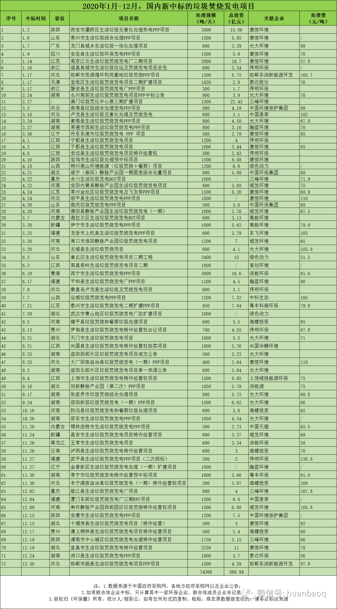 先是水務(wù)巨頭三峽集團(tuán)旗下子公司在湖北宜昌15天內(nèi)接連中標(biāo)2個(gè)垃圾焚燒發(fā)電訂單,高調(diào)“跨界”;緊接著半路出家、轉(zhuǎn)型不到3年的城發(fā)環(huán)境又要合并老牌環(huán)企啟迪環(huán)境,試圖打造黃河流域高質(zhì)量環(huán)保發(fā)展平臺(tái);然后“康恒僑銀”CP組合又從中國天楹、高能環(huán)境、偉明環(huán)保等一眾固廢名企中脫穎而出,中標(biāo)近5億元的湖北利川垃圾收集和焚燒發(fā)電一體化項(xiàng)目;最后,背靠浙江國資的浙能電力還擬以20.40元/股的價(jià)格,收購康恒環(huán)境最高5.9%的股權(quán)。“市場(chǎng)可以公開競(jìng)標(biāo)的項(xiàng)目一年比一年少,有些固廢名企的市場(chǎng)投資部都撤銷了,所以別再說什么垃圾焚燒項(xiàng)目‘跑馬圈地’了,都快沒‘地’可圈了?!?/span>某固廢企業(yè)市場(chǎng)投資部經(jīng)理表示。垃圾焚燒項(xiàng)目為啥少了?日處理規(guī)模數(shù)據(jù)為啥出現(xiàn)“斷崖式下滑”?市場(chǎng)真的沒“地”可圈了嗎?接下來,筆者將從項(xiàng)目分布的省份、日處理規(guī)模、總投資、中標(biāo)企業(yè)、處理費(fèi)等五大角度,通過大數(shù)據(jù)來解析一下2020國內(nèi)垃圾焚燒行業(yè)的四大特征,從而解釋之前高速增長的垃圾焚燒行業(yè)為何會(huì)在2020年迎來拐點(diǎn)?是“國補(bǔ)新政”惹得禍,還是市場(chǎng)真實(shí)需求在下滑?并提出“十四五”期間國內(nèi)垃圾焚燒市場(chǎng)發(fā)展的幾點(diǎn)建議,供大家參考。01