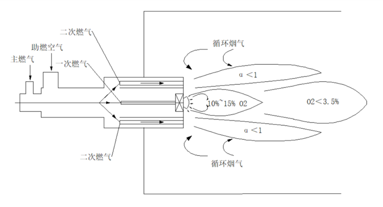 以低氮型調(diào)焰燃燒器為例,其利用空氣分級和燃氣分級原理,將燃料和空氣分配供給噴射單元,使火焰長度加長,更適合爐型較寬場合;可以通過調(diào)節(jié)一次氣和二次氣分配比例,調(diào)節(jié)火焰長短;利用濃淡燃燒原理,分配不同當量比的空氣與燃氣,使局部燃燒空間的燃料受到抑制,從而降低NOx排放。