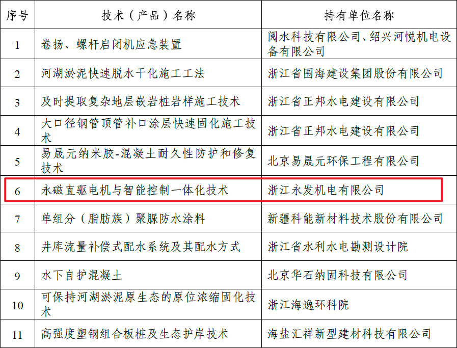 為進(jìn)一步推動(dòng)浙江省水利工程建設(shè)領(lǐng)域技術(shù)創(chuàng)新和成果轉(zhuǎn)化,提升水利工程建設(shè)的科技水平,經(jīng)征集、評(píng)審和公示等程序,結(jié)合近三批《浙江省水利新技術(shù)推廣指導(dǎo)目錄》,由浙江永發(fā)機(jī)電有限公司自主研發(fā)的“永磁直驅(qū)電機(jī)與智能控制一體化技術(shù)”等共28項(xiàng)技術(shù)(產(chǎn)品)列入2020年度浙江省水利工程建設(shè)領(lǐng)域新技術(shù)推廣應(yīng)用清單。