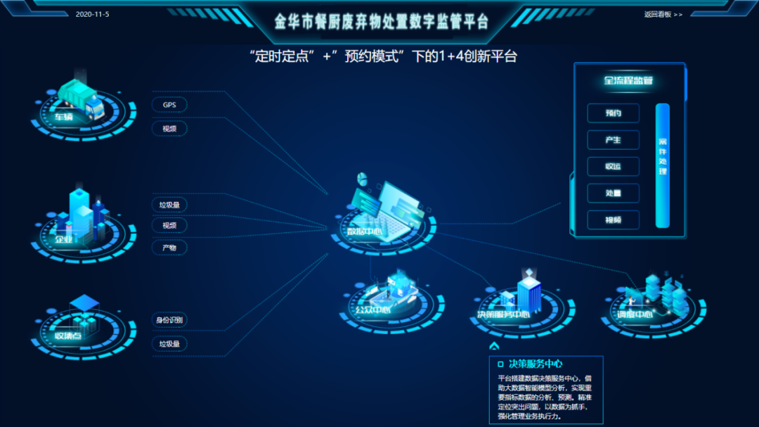 在政府監(jiān)管層面,依托餐廚垃圾信息化管理平臺,把產(chǎn)生點、收運單位、收運車輛、處置終端通過技術(shù)手段進行智能聯(lián)網(wǎng),形成餐廚垃圾智能監(jiān)控網(wǎng)絡(luò),及時發(fā)現(xiàn)并快速處理餐廚垃圾物收運處置過程中違規(guī)行為;通過成熟的信息技術(shù)手段,構(gòu)建大數(shù)據(jù)智能分析模型,使餐廚垃圾管理實現(xiàn)全程科學(xué)化監(jiān)控及實時管理,輔助分析決策。