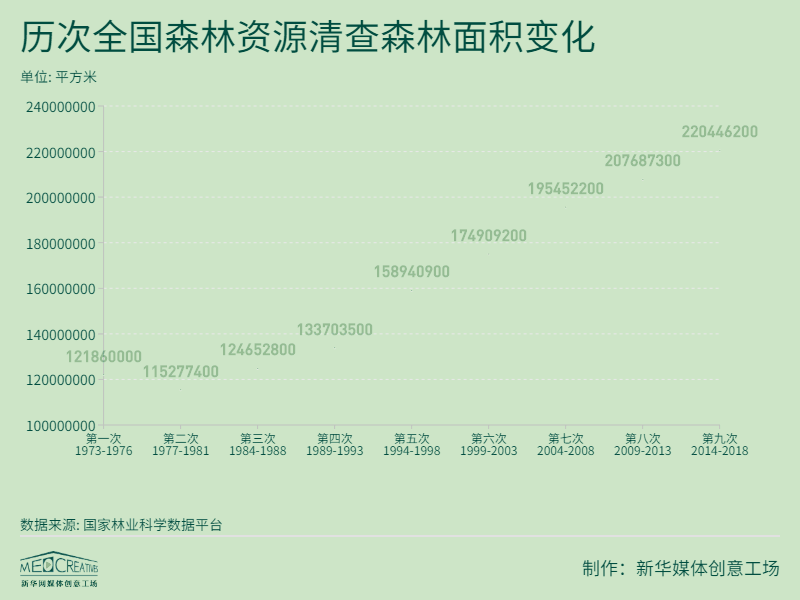 從1973年到2018年,在45年時間里,全國森林面積增長了98586200平方米,相當(dāng)于增加了約13808個標(biāo)準(zhǔn)足球場的面積。
