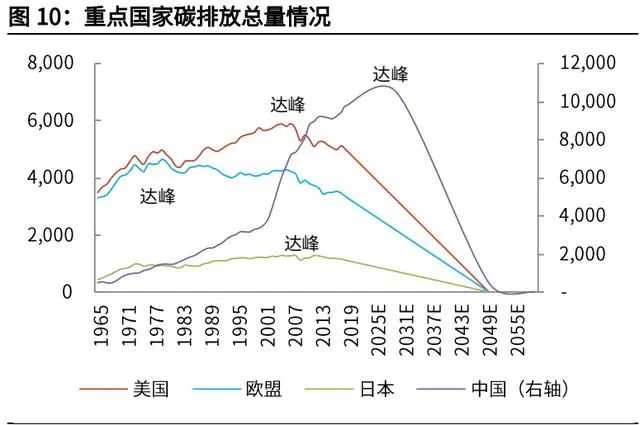 我國碳排放下降斜率更大。由于發(fā)展階段的不同,發(fā)達國家已普遍經(jīng)歷“碳達峰”, 為達到 2050 年“碳中和”,更大程度上只是延續(xù)以往的減排斜率。而我國碳排 放總量仍在增加,需要經(jīng)歷 2030 年前“碳達峰”,然后走向 2060 年前“碳中 和”。從實現(xiàn)“碳中和”的年限來看,比發(fā)達國家時間更緊迫,碳排放下降的斜 率更大。