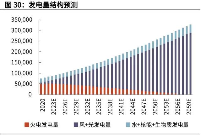 根據(jù)我們的上述假設(shè),以 2019 年發(fā)電量 7.22 萬億千瓦時為基礎(chǔ),2030 年發(fā)電 量達到 11.9 萬億千瓦時(和部分機構(gòu)的預(yù)測數(shù)據(jù)基本一致),2060 年發(fā)電量進一步達到 32.71 萬億千瓦時。