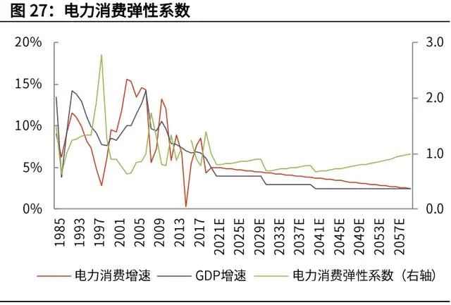 (1)我們采用“自上而下”的測算方法,假設(shè)未來 GDP 增速和發(fā)電量增速從“十 三五”末期的 5%逐步下降到 2.5%;而由于節(jié)能降耗的原因,未來單位 GDP 能 耗逐步下降,電力消費彈性系數(shù)將小于 1。