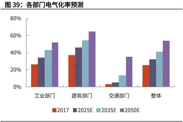 由于能源供給側(cè)向綠色電力轉(zhuǎn)變,所以需求側(cè)的脫碳首先意味著終端電氣化。根據(jù)國網(wǎng)能源研究院 2019 年 12 月的研究成果,終端電氣化率在 2050 年達到 50%以上,其中工業(yè)、建筑、交通部門分別達到 52%、65%、35%。
