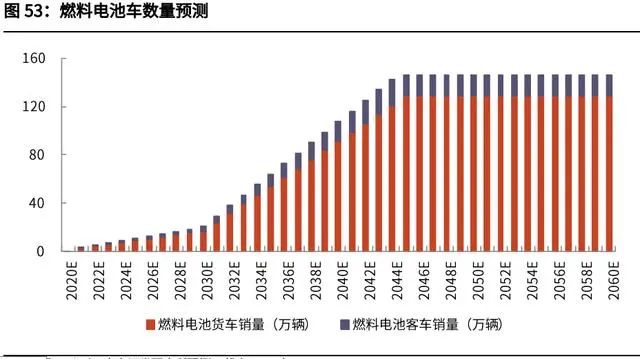 氫能燃料電池將主要用于重型道路交通(客車、貨車)。假設(shè)輕型、中型、大型 貨車的年銷量保持在 150、20、70 萬輛,燃料電池滲透率在 2045 年達到 40%、 60%、80%,而后保持該滲透率;輕型、中型、大型客車的年銷量保持 30、7、 7 萬輛,燃料電池滲透率在 2045 年達到 30%、50%、70%,而后保持該滲透率, 則累計新增投資達到 29 萬億元人民幣。