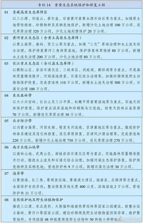 強化國土空間規(guī)劃和用途管控,劃定落實生態(tài)保護紅線、永久基本農(nóng)田、城鎮(zhèn)開發(fā)邊界以及各類海域保護線。以國家重點生態(tài)功能區(qū)、生態(tài)保護紅線、國家級自然保護地等為重點,實施重要生態(tài)系統(tǒng)保護和修復(fù)重大工程,加快推進(jìn)青藏高原生態(tài)屏障區(qū)、黃河重點生態(tài)區(qū)、長江重點生態(tài)區(qū)和東北森林帶、北方防沙帶、南方丘陵山地帶、海岸帶等生態(tài)屏障建設(shè)。加強長江、黃河等大江大河和重要湖泊濕地生態(tài)保護治理,加強重要生態(tài)廊道建設(shè)和保護。全面加強天然林和濕地保護,濕地保護率提高到55%??茖W(xué)推進(jìn)水土流失和荒漠化、石漠化綜合治理,開展大規(guī)模國土綠化行動,推行林長制。科學(xué)開展人工影響天氣活動。推行草原森林河流湖泊休養(yǎng)生息,健全耕地休耕輪作制度,鞏固退耕還林還草、退田還湖還濕、退圍還灘還海成果。