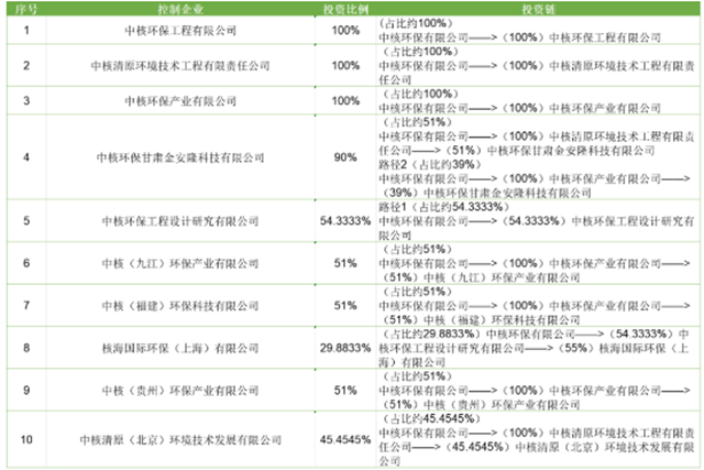 中國水網(wǎng)發(fā)現(xiàn),在中核環(huán)保所控制的27家企業(yè)中,環(huán)保企業(yè)共10家,包括中核清原環(huán)境技術工程有限責任公司,以及中核環(huán)保工程有限公司、中核環(huán)保產(chǎn)業(yè)有限公司、中核環(huán)保甘肅金安隆科技有限公司等,具體公司名稱、投資比例、投資鏈見下表。