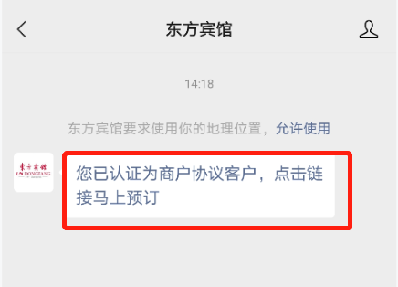 2、關(guān)注公眾號后點擊對話框鏈接進入酒店預(yù)定頁面;
