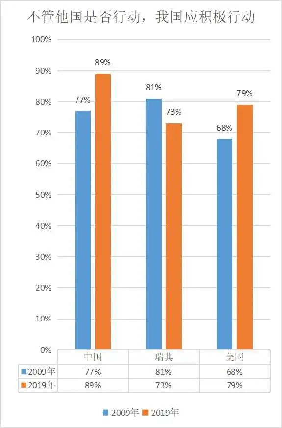 中國受訪者對我國應(yīng)該積極擔(dān)負(fù)起全球氣候變化和環(huán)境治理的領(lǐng)導(dǎo)責(zé)任,有了更高的支持和信心,且支持度遠(yuǎn)高于美國和瑞典。