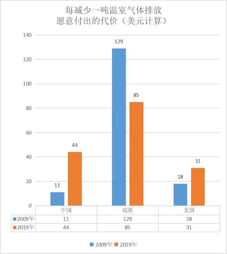 這種圖表中,雖然瑞典受訪者的支付意愿金額,依然是三國最高,但卻比十年前下降了34%,表現(xiàn)出其減排信心的衰弱。