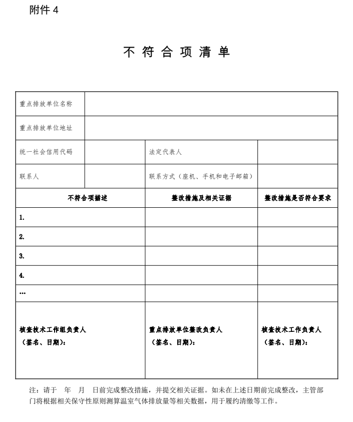 技術工作組應在收到《現(xiàn)場核查清單》后2個工作日內(nèi),對《現(xiàn)場核查清單》中未取得有效證據(jù)、不符合核算指南要求以及未按數(shù)據(jù)質(zhì)量控制計劃執(zhí)行等情況,在《不符合項清單》(見附件4)中“不符合項描述”一欄如實記錄,并要求重點排放單位采取整改措施。重點排放單位應在收到《不符合項清單》后的5個工作日內(nèi),填寫完成《不符合項清單》中“整改措施及相關證據(jù)”一欄,連同相關證據(jù)材料一并提交技術工作組。技術工作組應對不符合項的整改進行書面驗證,必要時可采取現(xiàn)場驗證的方式。