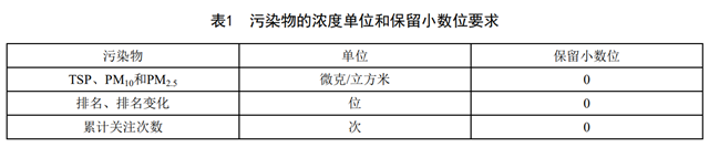 進(jìn)行環(huán)境空氣顆粒物網(wǎng)格化監(jiān)測(cè)評(píng)價(jià)前,各污染物項(xiàng)目的數(shù)據(jù)統(tǒng)計(jì)結(jié)果按照GB/T 8170中的規(guī)定進(jìn)行修約,濃度單位及保留小數(shù)位數(shù)要求見表1。環(huán)境空氣顆粒物的小時(shí)濃度值作為基礎(chǔ)數(shù)據(jù)單元,使用前也應(yīng)進(jìn)行修約。