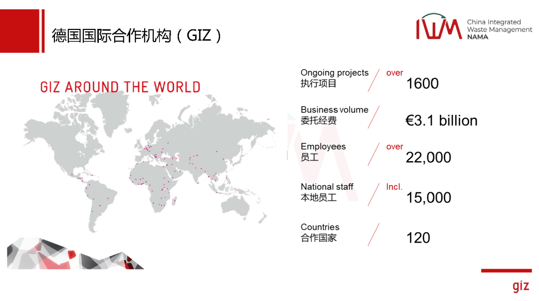 首先介紹一下德國(guó)國(guó)際合作機(jī)構(gòu),它其實(shí)算是德國(guó)的國(guó)企,唯一的股東是德國(guó)的經(jīng)合部,但是它是一個(gè)非盈利的企業(yè),我們所有的經(jīng)費(fèi)都來(lái)自于德國(guó)的政府以及歐洲的政府基金會(huì)。我們?cè)谌蛴?20多個(gè)辦事處,有兩萬(wàn)多個(gè)員工,1980年進(jìn)入中國(guó),目前有40多年的時(shí)間了。在中國(guó)有160個(gè)人,有100多位是中國(guó)同事,有60位是外國(guó)同事。