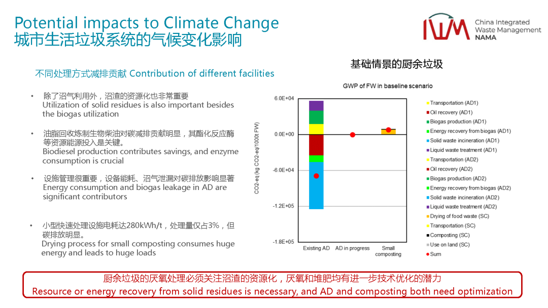 除了這個(gè)之外,我們也對(duì)不同的技術(shù)它的排放強(qiáng)度做了一個(gè)分析。比如剛剛說(shuō)了,未來(lái)垃圾分類要開(kāi)始了,有些垃圾都要被分出來(lái)了,都要處理,不同的處理技術(shù)它的減排貢獻(xiàn)是什么樣的,不同的技術(shù)處理有不同的技術(shù)路線,我們會(huì)分析堆肥,厭氧技術(shù),我們可以看到這個(gè)就是用了經(jīng)典的全生命周期的分析方法,我們委托丹麥科技大學(xué),是丹麥科技大學(xué)他們自行研發(fā)的一個(gè)分析工具,這個(gè)在垃圾領(lǐng)域是非常有名的,也得到了全球的認(rèn)可。在這個(gè)里面我們會(huì)去分析它不同的處理環(huán)節(jié)對(duì)減排的貢獻(xiàn),可以看到有機(jī)垃圾絕對(duì)是非常減排的,但是減排的前提是在于我除了要把沼氣用好之外,沼渣的資源化也非常重要。如果我的有機(jī)垃圾處理完了之后,沼渣要么實(shí)現(xiàn)土地利用,替代一部分的有機(jī)肥,或者回到土地去做碳匯,哪怕從純減排的角度,重新回到焚燒廠焚燒,實(shí)現(xiàn)資源的回收,這兩部分都可以貢獻(xiàn)比較明顯的減排量。但是沼渣處理之后回到填埋場(chǎng),從整個(gè)流程來(lái)講,減排的效益沒(méi)有那么明顯,可能會(huì)導(dǎo)致一部分負(fù)面的影響。同時(shí)油脂的回收,去做生物柴油,這個(gè)對(duì)減排的貢獻(xiàn)是非常明顯的。