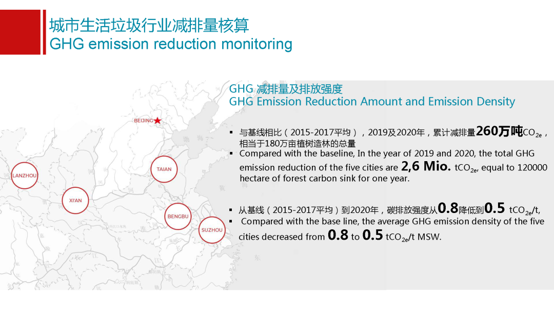 這里面也得到了試點(diǎn)城市特別主動(dòng)的支持,在西安他們新建的焚燒廠配備了設(shè)備,這給我們國(guó)家的焚燒企業(yè)將來(lái)在這個(gè)行業(yè)里面他們的氧化亞氮的排放情況怎么樣,能夠提供第一手的數(shù)據(jù)。在這個(gè)基礎(chǔ)模型的處置上,我們有了幾個(gè)基線選擇,選擇了2015到17年三年的平均值,作為我們整個(gè)項(xiàng)目的基線。在這之后,2019年和2020年我們兩年分別去這五個(gè)城市做了監(jiān)測(cè),可以看出有一些初步的結(jié)論。第一關(guān)于減排量和排放強(qiáng)度,這兩年從19年和20年,與基線相比,五個(gè)城市累計(jì)實(shí)現(xiàn)減排量260萬(wàn)噸二氧化碳當(dāng)量,這個(gè)相當(dāng)于是180萬(wàn)畝植樹(shù)造林,一年的碳匯地量,也是非常可觀的數(shù)據(jù)。除了排放總量,會(huì)有一個(gè)特別好的數(shù)值就是排放強(qiáng)度,垃圾管理行業(yè)排放強(qiáng)度是多少,從基線值到2020年,我們五個(gè)城市平均碳排放強(qiáng)度從0.8噸二氧化碳當(dāng)量每噸垃圾降到了0.5,能夠看出中國(guó)垃圾行業(yè)以五個(gè)試點(diǎn)城市為例,已經(jīng)實(shí)現(xiàn)向低碳化發(fā)展的轉(zhuǎn)型。碳排放強(qiáng)度的降低已經(jīng)達(dá)到了40%以上,能夠看到我們行業(yè)是在更清潔、更低碳,這個(gè)是一個(gè)特別有意義的數(shù)據(jù)。我們也分享給我們總部以及國(guó)際同事,他們非常認(rèn)可,能夠看到中國(guó)垃圾行業(yè)在向低碳方面轉(zhuǎn)型升級(jí)。