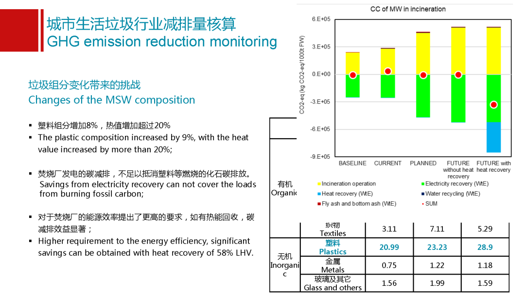 這是以蘇州為例,蘇州做的特別好,他們每年有定期大量的數(shù)據(jù)監(jiān)測(cè),能夠證實(shí)我這個(gè)數(shù)據(jù)的科學(xué)性和可靠性。可以看到蘇州從17年到19年它的塑料含量增加了8%,這個(gè)可能有比較多的原因。比如生活方式的改變,是不是用了更多的快遞,經(jīng)濟(jì)水平是不是更發(fā)達(dá)了,以及是不是有可能整個(gè)垃圾收運(yùn)管理體系以及環(huán)保要求更高,讓更多的品類進(jìn)入到我的垃圾體系里面來(lái)。但是我必須要看到整個(gè)垃圾處理,什么東西進(jìn)到焚燒廠,這個(gè)是有變化的。組分雖然增加了8%,但是對(duì)熱值貢獻(xiàn)是20%,如果焚燒廠不作出相應(yīng)的響應(yīng),不提高能效,之后產(chǎn)生的減排效益不足以抵消新增的塑料產(chǎn)生的排放,焚燒廠需要進(jìn)一步的優(yōu)化。對(duì)焚燒廠的能源效率提出更高的要求,我們初步核算一下,如果一個(gè)焚燒廠在目前我們的垃圾組分的情況下,我們現(xiàn)在五個(gè)城市的焚燒廠基本上都能夠?qū)崿F(xiàn)噸垃圾發(fā)電量400度左右,這個(gè)已經(jīng)很高了,他們的熱效率是在28%,還能夠維持比較好的狀態(tài)。但是如果我們將來(lái)熱值或者我的組分還會(huì)進(jìn)一步變化,因?yàn)槔诸愖龅脑絹?lái)越好,肯定熱值會(huì)越來(lái)越高。我的焚燒廠的能效就要進(jìn)一步提高,否則可能會(huì)從一個(gè)有很好的減排效益的設(shè)施變化成碳排放強(qiáng)度可能是最高的,這個(gè)很重要。對(duì)焚燒廠來(lái)講,如果他能夠?qū)崿F(xiàn)熱能回收,就像我們上面那個(gè)圖,會(huì)給出一些建議。提高發(fā)電效率很重要,但是電和熱的回收能夠?qū)崿F(xiàn)更高的能效的利用,可能就會(huì)有更好的減排效益,這也是在焚燒企業(yè)將來(lái)去做發(fā)展戰(zhàn)略的時(shí)候需要重點(diǎn)考慮的一個(gè)問(wèn)題。