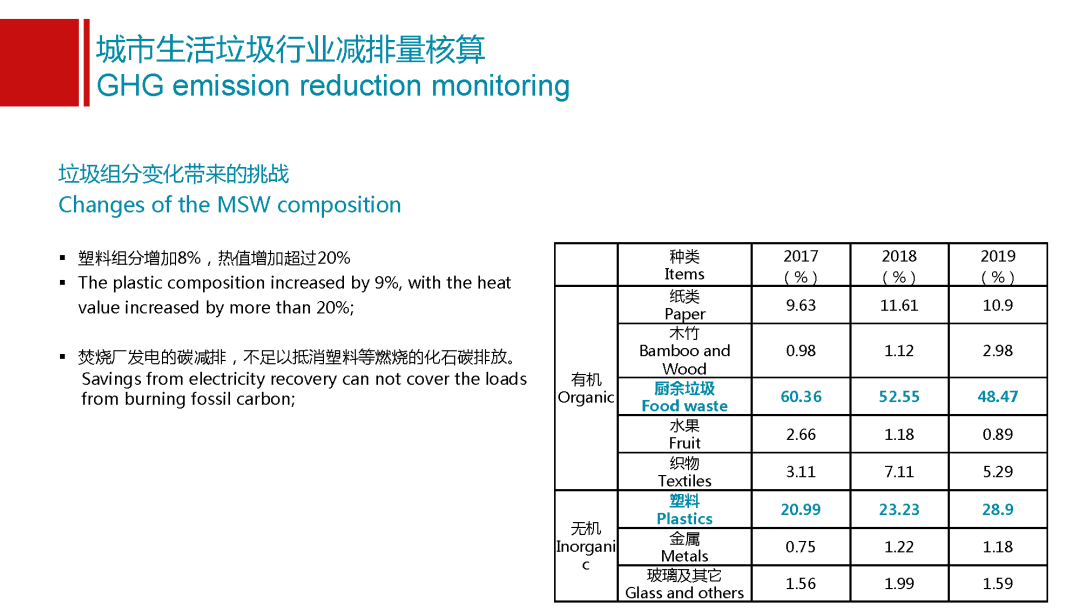 另外一點(diǎn),我還想分享的是垃圾組分給我們整個(gè)垃圾行業(yè)帶來(lái)的挑戰(zhàn),很多時(shí)候會(huì)說(shuō)整個(gè)事情的發(fā)展都是日新月異的,我們能夠看到我們垃圾的成分也有非常明顯的變化。