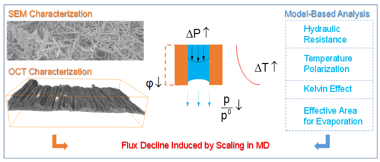 圖2基于表征與模擬分析結垢誘發(fā)膜蒸餾通量下降的示意圖(JMS期刊圖形摘要